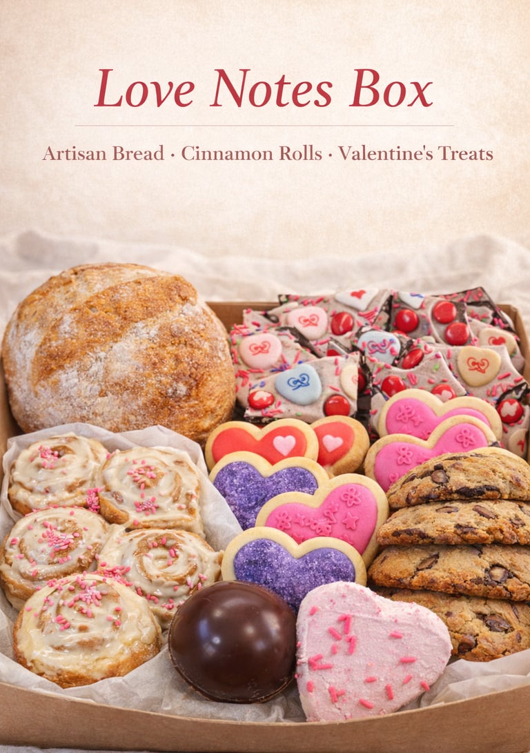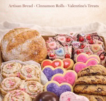 Artisan bread, Cookies, and Cinnamon Rolls as well as Valentine-Themed treats like iced sugar cookies, Valentine Bark, and hot cocoa bombs with homemade marshmallows