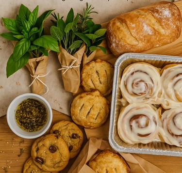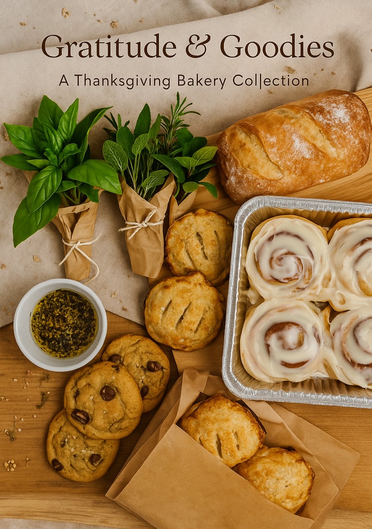 Artisan bread, Chocolate Chip Cookies, Fall Hand Pies, Cinnamon Rolls, and Herb Bouquet Bundles